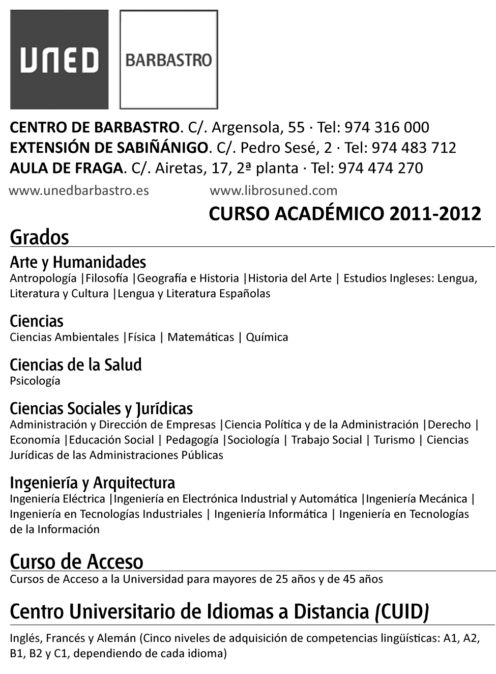 Biblioteca: El Centro cuenta con un amplio fondo bibliográfico, distribuido entre sus tres sedes (Barbastro, Fraga y Sabiñánigo), e incluido en el catálogo general y online de la UNED, donde el estudiante puede consultar la bibliografía recomendada, la producción audiovisual de la UNED y otra gran variedad de material propio de una biblioteca universitaria.