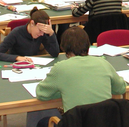 Son días de muchos nervios y tensión. La típica promesa de llevar las cosas al día, que se suele plantear a comienzo del curso, pocos la suelen cumplir, por lo que se encuentran ahora con todo el trabajo atrasado. Cafés y bebidas energéticas estimulantes experimentan en esta época un espectacular consumo entre los universitarios para permanecer despiertos y poder estudiar el máximo de horas posibles. Se amplía el horario de las bibliotecas, en el caso de nuestro centro permanecerá abierta de 9 a 20 h. ininterrumpidamente.