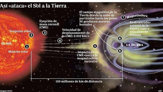 Los efectos de esta tormenta solar de clase M8,7 (las hay A, B, C, M y X, letras a las que sigue un número del 1 al 9), seguirán notándose durante todo el día de hoy, aunque no se esperan daños de consideración, pese a ser la más intensa desde 2005. Pero lo peor podría estar por llegar. En los últimos siete días, las manchas solares 1401 y 1402 han desplegado una inusitada actividad. De hecho, han ocasionado hasta tres llamaradas solares, cada una más fuerte que la anterior. La primera alcanzó Venus el pasado día 17 y, literalmente, le arrancó una pequeña parte de su atmósfera. Era de clase C6, es decir, mediana. La segunda, de clase M3, fue lanzada contra la Tierra y nos alcanzó el pasado fin de semana sin mayores consecuencias, ya que fue desviada por el «escudo natural» de nuestro planeta, la magnetosfera. La de ayer y hoy, la más fuerte de las tres, ha sido de clase M8,7 y estamos aún bajo sus efectos.