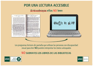 La Biblioteca de la UNED junto con UNIDIS, quiere que seamos conscientes de este problema y vamos a darlo a conocer, mediante carteles expuestos en nuestras bibliotecas, marca páginas y entradas en las redes sociales, de esta manera, cuando vayamos a subrayar un libro, que no sea nuestro, nos daremos cuenta de que no sólo es un acto incívico, sino que además tiene repercusiones graves en dichas personas.