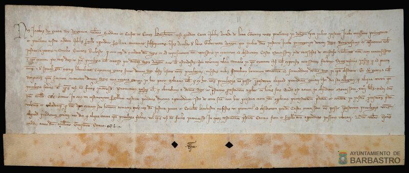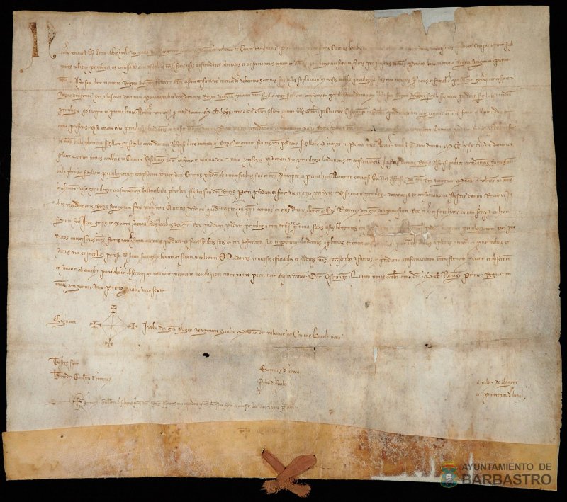 Jaime II de Aragón confirma los privilegios y fueros concedidos por sus antecesores a los habitantes de Barbastro con especial mención al Privilegio General otorgado por Pedro III en 1283. Zaragoza, 3 de octubre 1291.