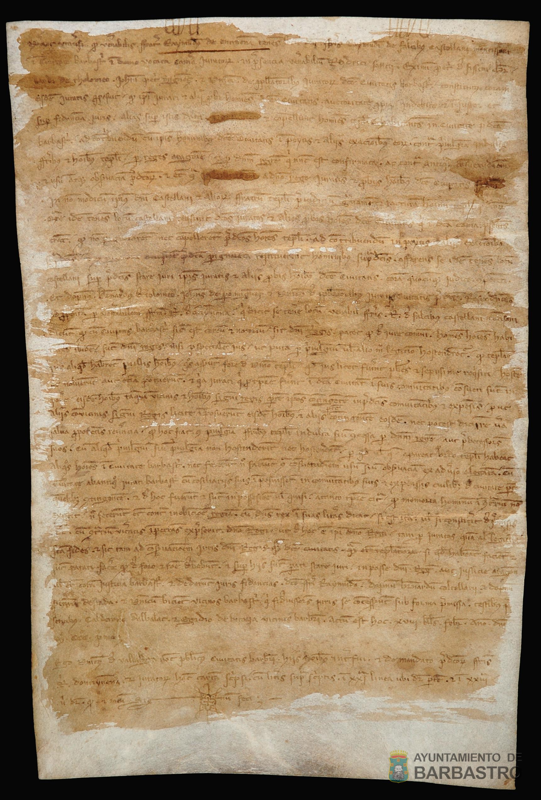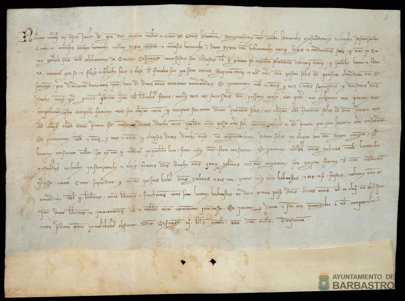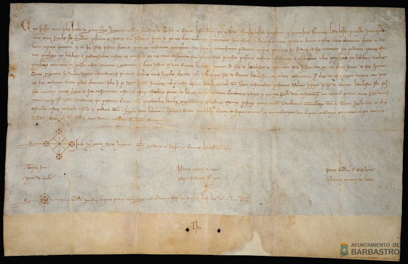 Pretendemos con esta exposición dar a conocer y difundir el patrimonio documental del Ayuntamiento, es decir, de los ciudadanos de Barbastro. Los documentos reflejan la incidencia de determinadas decisiones reales en el acontecer y en la vida de los barbastrenses de finales del siglo XIII y principios del XIV.