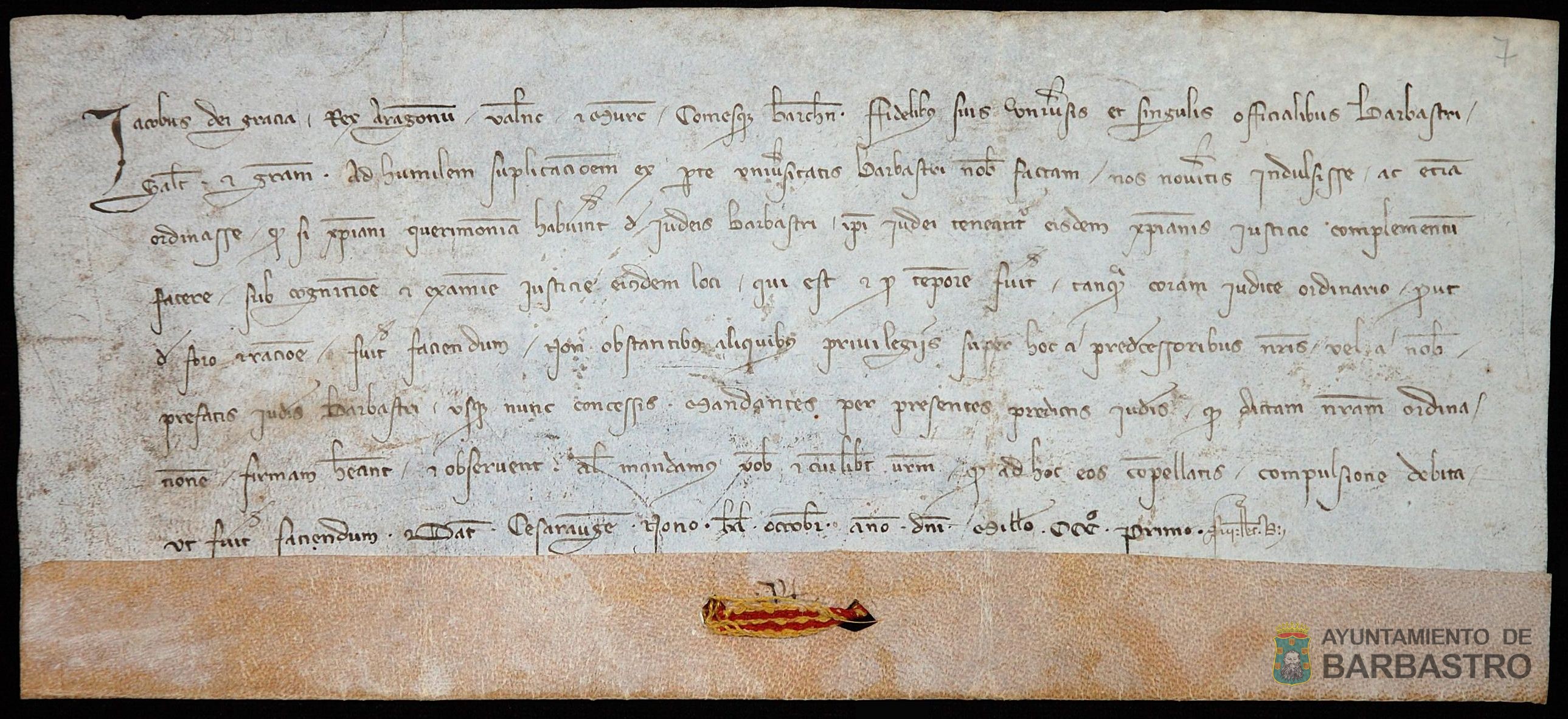 Jaime II de Aragón ordena que los conflictos entre cristianos y judíos sean juzgados por el justicia del lugar o juez ordinario, siempre y cuando no contravengan los privilegios concedidos a los judíos por los reyes. Zaragoza, 23 de septiembre 1301.
