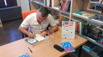 Firma de libros del poeta y narrador barbastrense Manuel Vilas en la librería Valentina Cancer de la UNED de Barbastro.