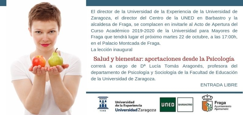 “Salud y bienestar: aportaciones desde la Psicología” lección inaugural de la Universidad de la Experiencia de Fraga el 22 de octubre.