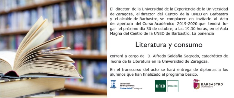“Literatura y Consumo”, lección inaugural de la Universidad de la Experiencia de Barbastro el 30 de octubre.