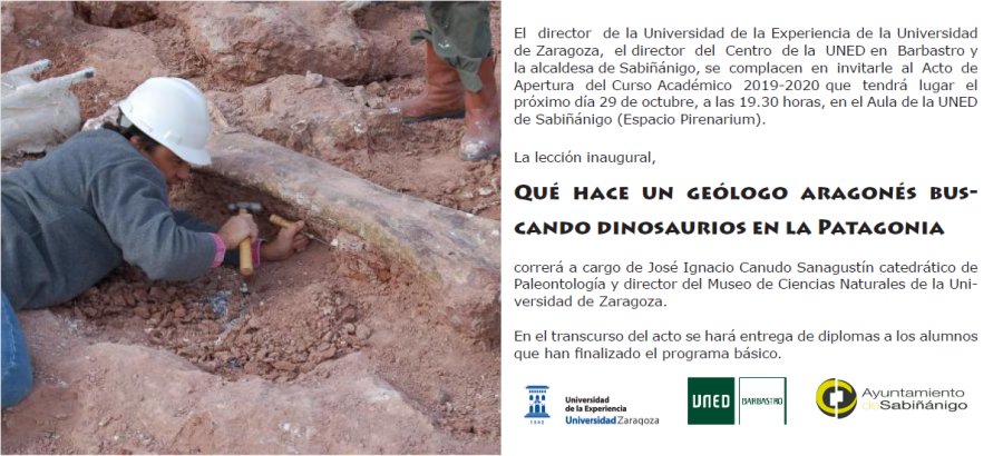 “Qué hace un geólogo aragonés buscando dinosaurios en la Patagonia” lección inaugural de la Universidad de la Experiencia de Sabiñánigo el 29 de octubre.