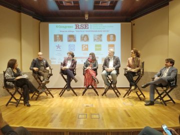 Mesa de diálogo "Política y Responsabilidad Social" formada por Carles Campuzano, Mario Garcés, Susana Gaspar, Juantxo López de Uralde y Lucía Velasco, y moderada por Miwi Clavera y David Lafuente en la UNED de Barbastro.