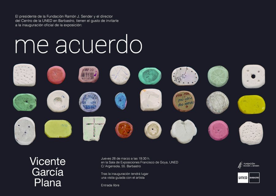 El artista Vicente García Plana expone a partir del 28 de marzo sus últimos trabajos en la Sala de Exposiciones Francisco de Goya de la UNED de Barbastro. Bajo el título Me acuerdo, el artista presenta una serie de piezas con las que explora las conexiones entre el objeto encontrado y la memoria, una línea de trabajo mostrada recientemente en la magnífica exposición del IAACC El objeto de la memoria que partía de varias instalaciones de objetos perfectamente clasificados y ordenados, y en la que aparecían como generadores de recuerdos.
