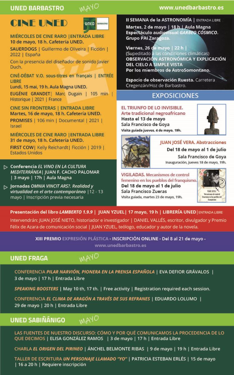 Relación de todas las actividades programadas en el Centro de la UNED de Barbastro y en sus aulas de Fraga y Sabiñánigo durante el mes de mayo de 2023.