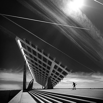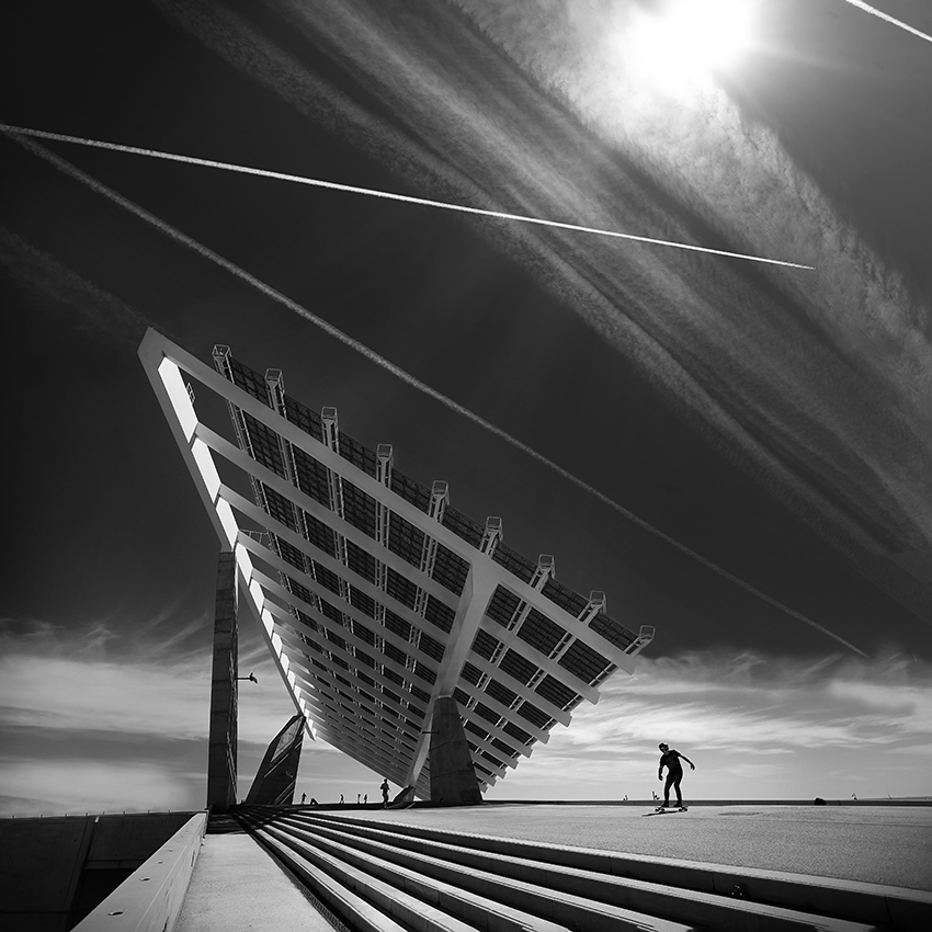 La pérgola fotovoltaica del Fórum -2004- está considerada como una gran obra de ingeniería y de la Nueva Arquitectura de Barcelona. Contiene casi tres mil paneles de aprovechamiento de la energía solar constituyendo todo un símbolo de sostenibilidad y aprovechamiento de los recursos naturales por el uso de las energías renovables. La fotografía se completa incluyendo al Sol como la fuente originaria de la energía, y las diagonales de las estelas blancas de los aviones que surcan el cielo. Estas estelas -estelas de condensación- que físicamente se forman por los gases que expulsan los motores de los aparatos al salir a una temperatura superior a la del exterior, en la fotografía acentúan la sensación de dinamismo de la imagen.