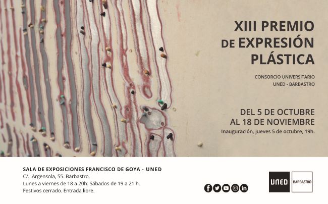 El Premio de Expresión Plástica del Consorcio Universitario del Centro de la UNED en Barbastro comenzó su andadura en el año 1996, con el deseo de fomentar la creación artística y contribuir a la difusión del arte contemporáneo en el territorio. En esta su décimo segunda edición, animamos al público a visitar la muestra de 26 artistas contemporáneos en su variedad de estilos, técnicas y formatos.