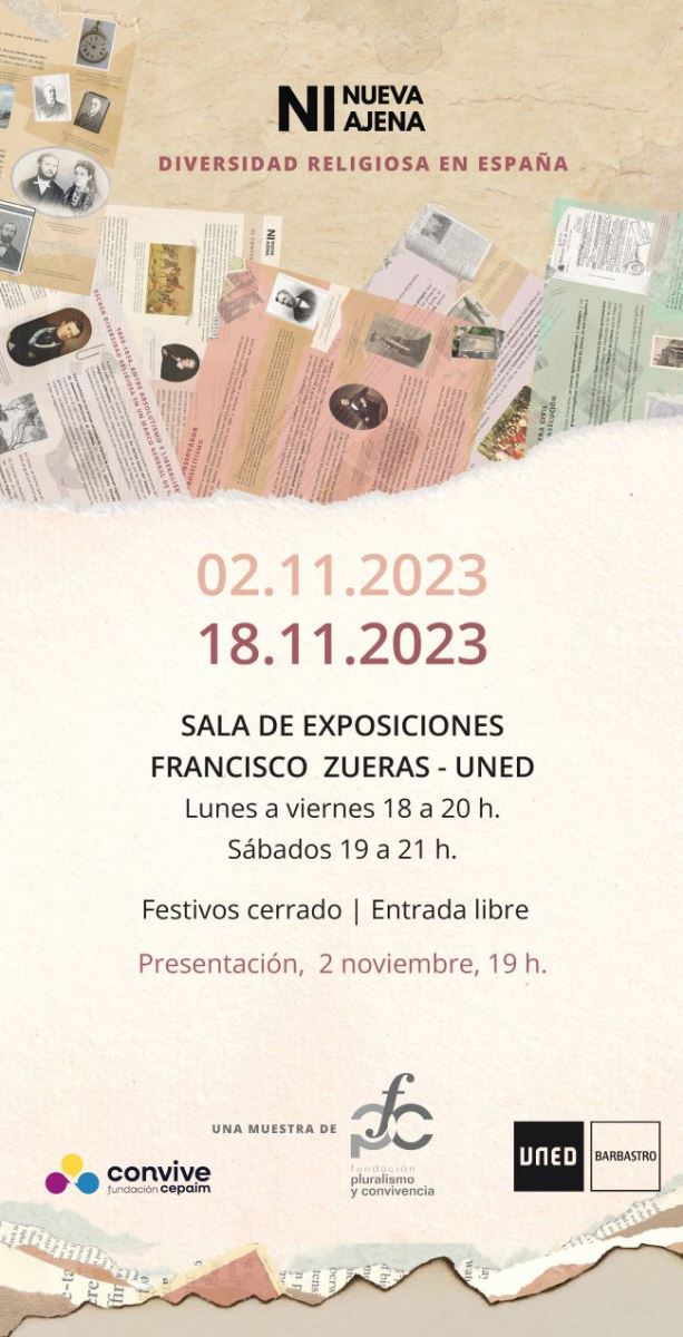 NI NUEVA NI AJENA es una exposición de la Fundación Pluralismo y Convivencia (FPyC) que da cuenta del camino recorrido para dejar atrás siglos de confesionalidad doctrinal e intolerancia, hasta alcanzar el reconocimiento de la libertad religiosa como un derecho fundamental, y visibiliza la histórica presencia de las minorías religiosas en España y su lucha por el reconocimiento de la libertad religiosa.