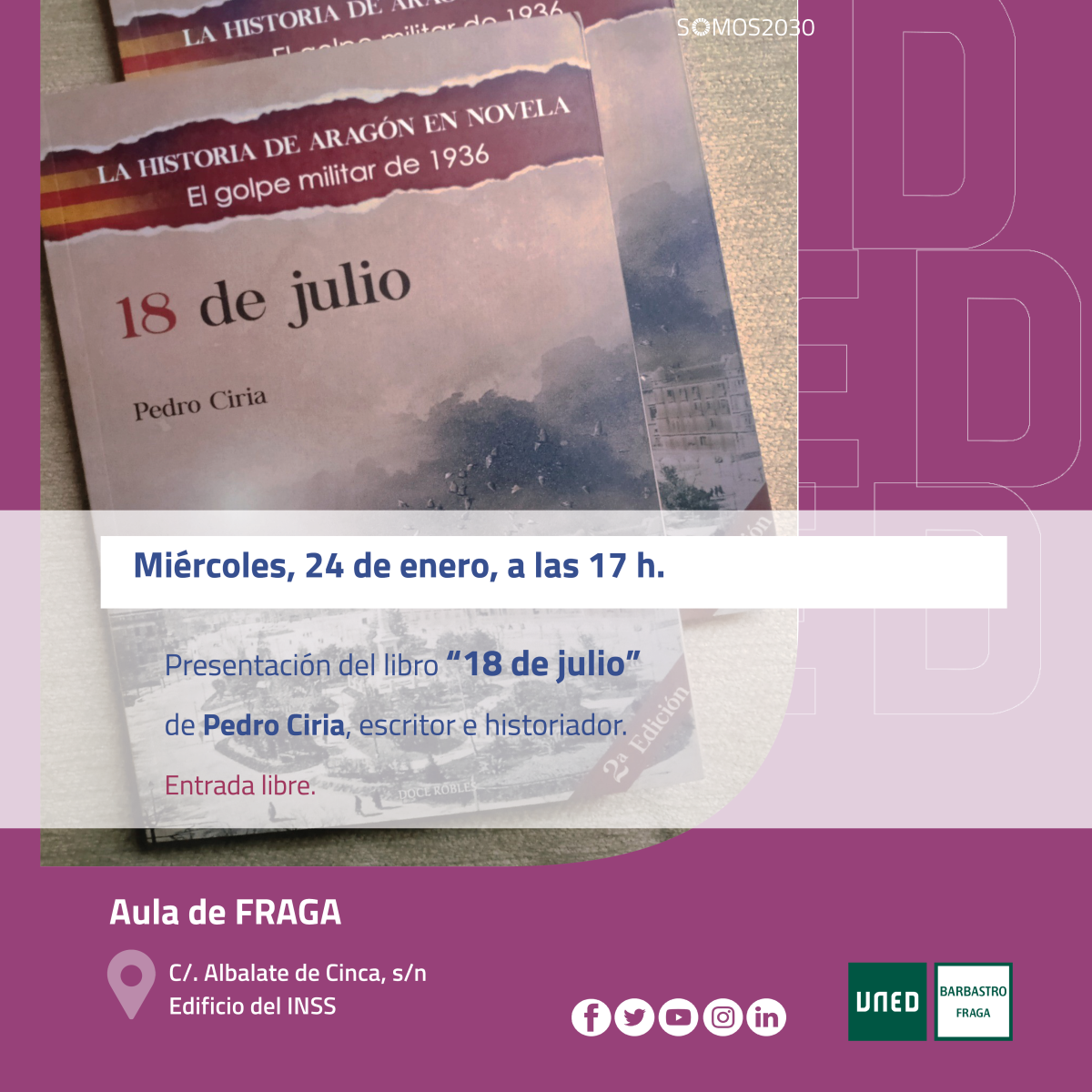 18 de julio, del escritor e historiador Pedro Ciria, es la primera novela que explica, con minucioso detalle y notable tensión, las dramáticas 36 horas que convirtieron a una ciudad tranquila como Zaragoza en un polvorín. Y en el ojo de la tormenta, un joven periodista de El Noticiero y una estudiante de Medicina van a desempeñar un arriesgado papel.