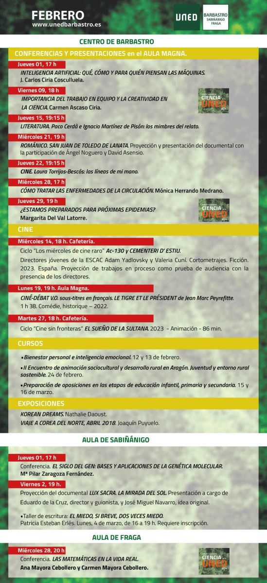 Actividades programadas para el mes de Febrero en la UNED de Barbastro y sus Aulas de Fraga y Sabiñánigo.