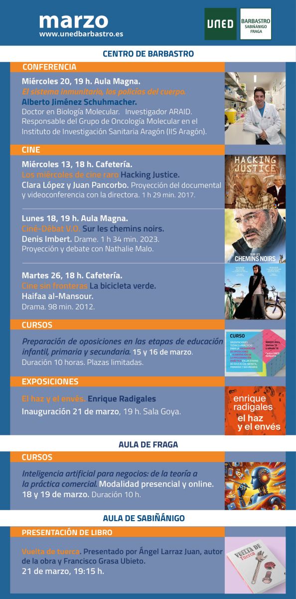 Actividades programadas para el mes de marzo en la UNED de Barbastro y sus Aulas de Fraga y Sabiñánigo.