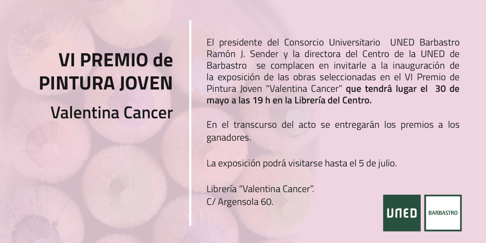 Entrega de premios e inauguración de la exposición de las obras seleccionadas en el «VI Premio de Pintura Joven Valentina Cancer» el jueves, 30 de mayo, a las 19 horas, en la Librería de UNED Barbastro.
