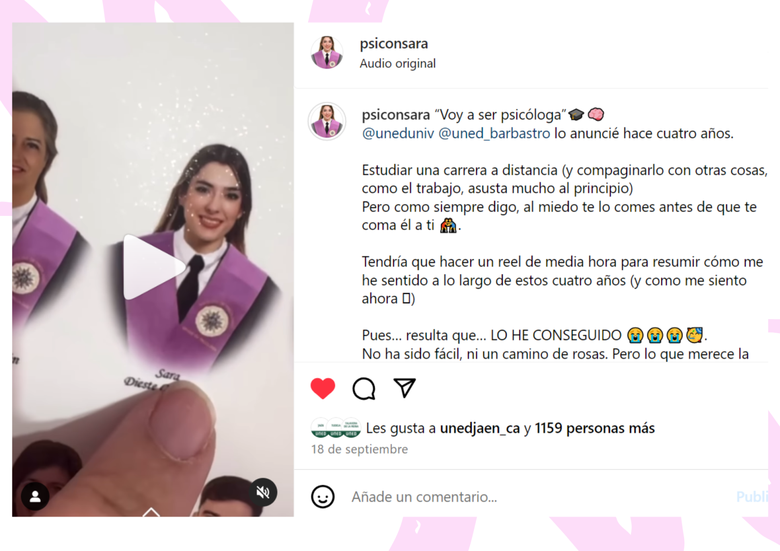No puedo evitar mencionar aquí el grandísimo crecimiento personal que he adquirido a lo largo de estos años. Creo firmemente que la UNED te cambia, no eres el mismo que cuando empezaste. Y en mi caso, ha impactado sumamente de forma positiva. No solo soy psicóloga, soy una mejor versión de mí misma.