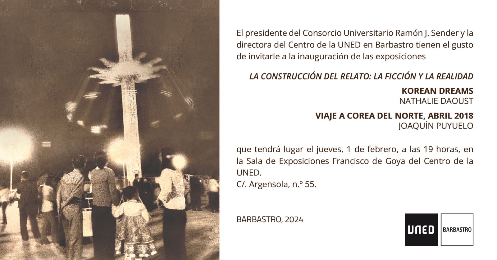 - “Indescriptibles mañanas”, Ayuntamiento de Barbastro (Huesca). Casa de Cultura. (22 de marzo a 8 de abril).