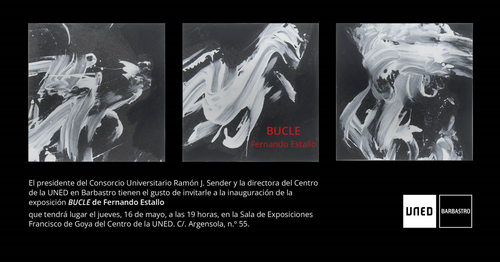 El Centro de la UNED de Barbastro acoge la exposición BUCLE, de Fernando Estallo, escritor, poeta, gran lector, humanista y artista barbastrense, quien nos propone su última serie de pinturas sobre papel en gran formato, dos grandes murales, poemas y pequeñas piezas, inspiradas en la obra del filósofo francés Maurice Merleau-Ponty ‘Lo visible y lo invisible’. De formación autodidacta, con una larga trayectoria artística y cultural, Fernando Estallo nos cuenta una parte de él a través de la pintura porque, como él mismo dice, no pinta para los demás, es su concepto estético y filosófico el que le lleva a crear sus obras.