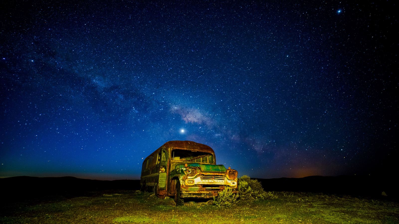 Cielo nocturno con la Vía Láctea visto desde el hemisferio sur, en escena un bus abandonado que trasladó a muchos hasta el fin del mundo, tierra del fuego en la región de Magallanes, Chile.