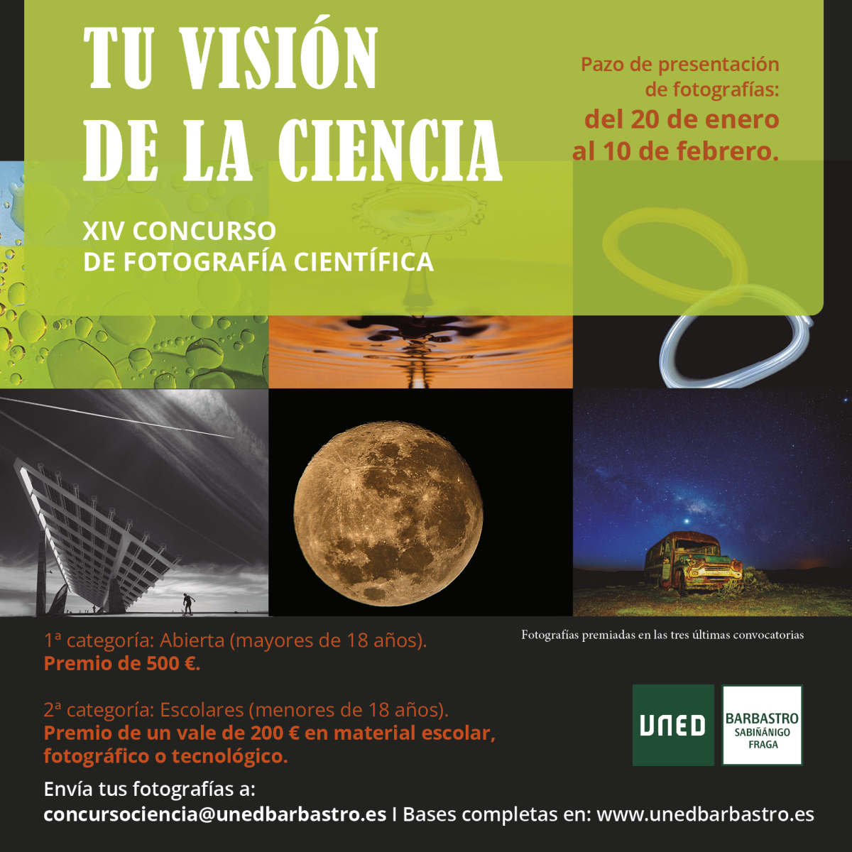 Con el objetivo de fomentar la creatividad científico-artística de los estudiantes y el público en general, además de acercar la ciencia y la tecnología a la sociedad, a través de la fotografía, desde una perspectiva artística y estética. La UNED de Barbastro convoca una nueva edición (la 14ª) del Concurso de Fotografía Tu visión de la ciencia, con la colaboración de la Asociación Fotográfica y de la Imagen de Barbastro (AFIB).