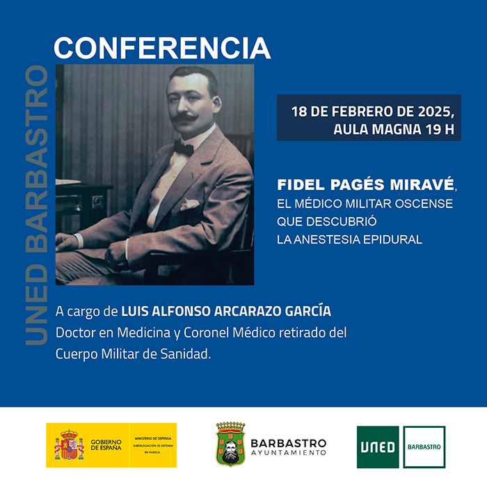 La anestesia epidural fue uno de los grandes avances en la medicina a nivel mundial a principios del siglo XX. Más desconocido es que Fidel Pagés, médico militar formado en la Universidad de Zaragoza, fue el primero en desarrollar esta técnica tan usada actualmente en aliviar el dolor del parto, así como en cirugía genito-urinaria o en traumatología. En el año 2021 se cumplió el primer centenario del descubrimiento de la anestesia metamérica, más conocida como anestesia epidural, por el doctor de la Sanidad Militar Fidel Pagés Miravé (1886-1923). Con motivo de este aniversario, la Delegación de Defensa en Aragón desarrolló un proyecto de exposición itinerante para el reconocimiento y puesta en valor de las aportaciones de este médico oscense a la medicina actual. La muestra consta de una serie de paneles en los que se recorren los principales hechos de la vida de Fidel Pagés y sus aportaciones a la medicina, en el contexto de los acontecimientos bélicos de principios del siglo XX en el norte de África. Además, los visitantes podrán ver instrumental original de la época, prestado por Luis Alfonso Arcarazo.