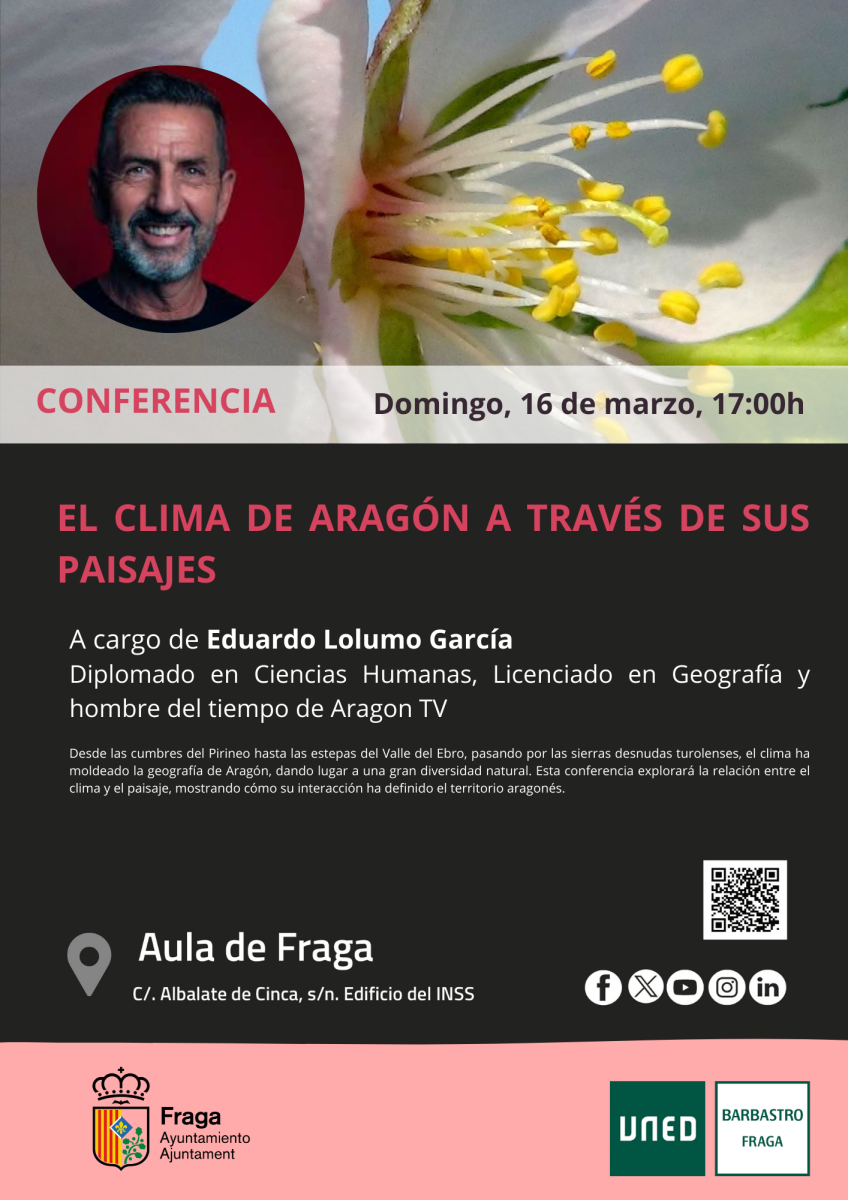 El 16 de marzo, Fraga se viste de colores con la floración, un espectáculo natural que marca el inicio de la primavera y transforma los campos en un mar de tonalidades rosadas y blancas. En este contexto privilegiado, en el que la naturaleza muestra su esplendor, UNED Fraga acoge la conferencia El clima de Aragón a través de sus paisajes, a cargo de Eduardo Lolumo García, geógrafo y conocido "hombre del tiempo" en Aragón TV.