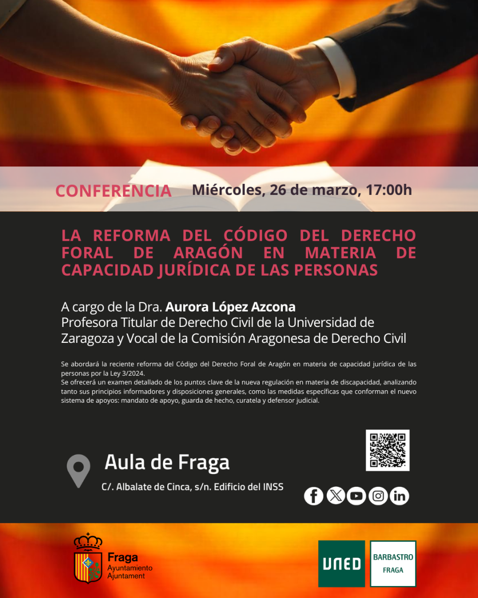 La conferencia, a cargo de la Dra. Aurora López Azcona, profesora titular de Derecho Civil de la Universidad de Zaragoza y vocal de la Comisión Aragonesa de Derecho Civil, pretende abordar la reciente reforma del Código del Derecho Foral de Aragón en materia de capacidad jurídica de las personas por la Ley 3/2024.