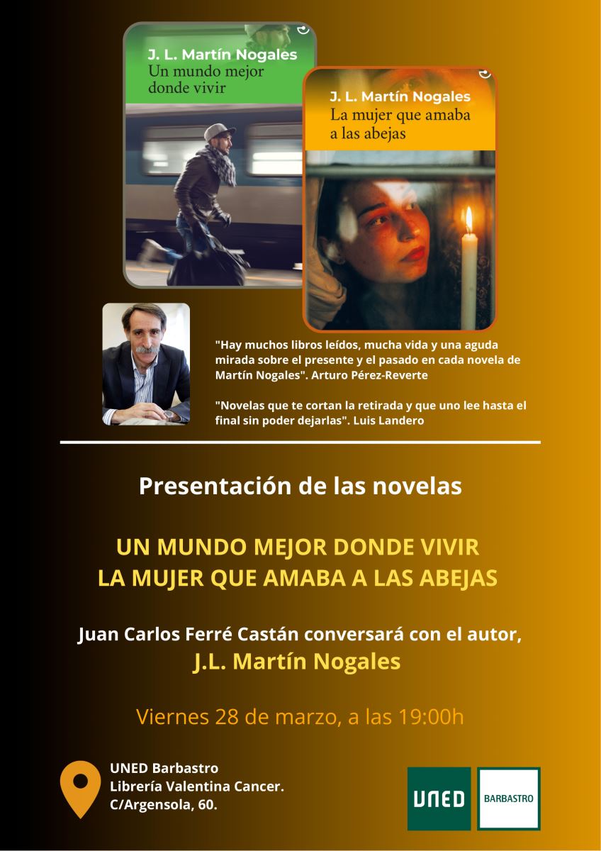 José Luis Martín Nogales (Burgos en 1965), filólogo y profesor de Literatura. Experto en literatura española contemporánea, campo en el que ha publicado varios ensayos académicos. También ejerce como crítico literario en Diario de Navarra y Zenda y ha colaborado en El Mundo, El Sol, El País, El Diario Vasco, tarea por la que le fue otorgado el Premio Atlántida por el Gremio de Editores. Ha realizado también la selección y el prólogo de los libros de artículos de Arturo Pérez-Reverte. Fue director de la UNED en Pamplona y también dirigió el Premio Mario Vargas Llosa NH de Relatos, así como la revista literaria Lucanor. En lo literario, ha publicado títulos como El faro de los acantilados (11.ª edición), Herederos del paraíso, La mujer de Roma (editada en España, México e Italia), Verás caer una estrella —Premio Fundación Cuatrogatos 2021— (4.ª edición), La mujer que amaba a las abejas (2023) y Un mundo mejor donde vivir (2024).