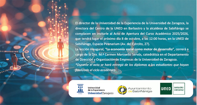 En el Acto de Apertura del Curso Académico 2025-2026, que tendrá lugar en el Aula de la UNED de Sabiñánigo el próximo miércoles, día 8, a las 12:00 horas, participarán representantes de las tres instituciones que hacen posible este proyecto formativo; Universidad de la Experiencia de la Universidad de Zaragoza, UNED Barbastro y Ayuntamiento de Sabiñánigo.