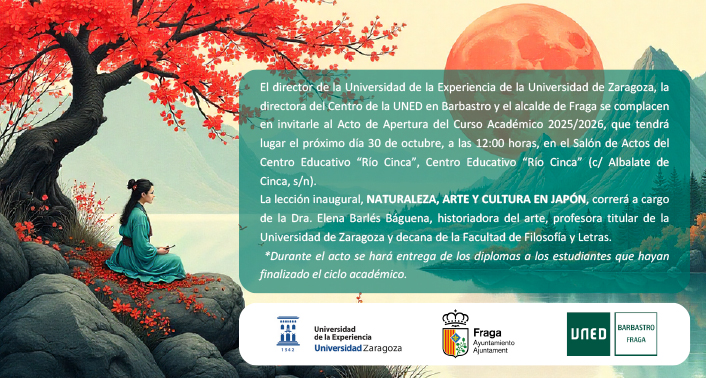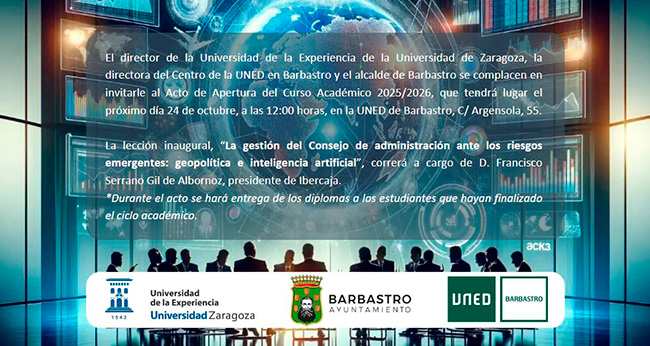 El director de la Universidad de la Experiencia de la Universidad de Zaragoza, la directora del Centro de la UNED en Barbastro y el alcalde de Barbastro se complacen en invitarle al Acto de Apertura del Curso Académico 2025/2025, que tendrá lugar el próximo 24 de octubre, a las 12:00 horas, en la UNED de Barbastro.