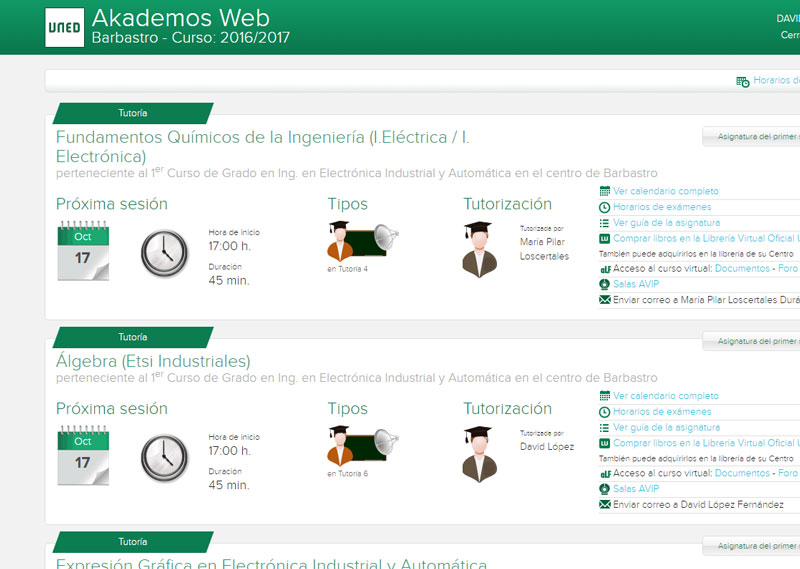 Mis tutorías (Akademos Web) es el espacio con información personalizada sobre cuestiones académicas: calendario de tutorías, planificación de las sesiones, horarios de exámenes, guía de las asignaturas, librería, acceso a las emisiones virtuales y contacto con el tutor.