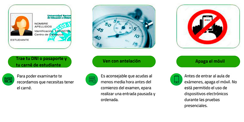 Es importante que antes de acudir al centro, compruebes en qué día y hora tendrán lugar tus exámenes, revisando el calendario de exámenes general de la UNED, o bien el calendario personalizado validándote en tu campus de estudiante de la UNED (apartado 'Evaluación').